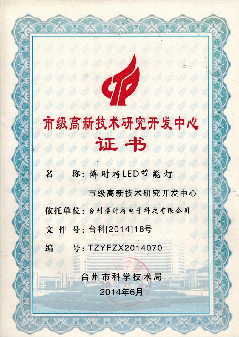 市級(jí)高新技術(shù)研究開發(fā)中心證書